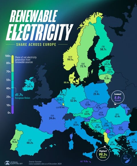 Source: Visual Capitalist. The share of renewable electricity in net electricity generation is shown by European country, based on Eurostat data. The figures include electricity generated from wind, solar, hydro, geothermal and biofuels.